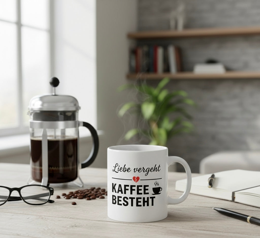 Tasse mit Spruch „Liebe vergeht – Kaffee besteht“ | Freches Design für Kaffeeliebhaber | Tassenworte