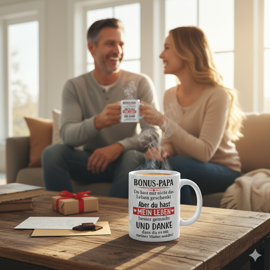 Diese einzigartige Tasse ist die herzlichste Art, einem besonderen Menschen zu sagen: "Danke, dass du Teil meines Lebens bist." Es ist eine tief empfundene Anerkennung für all die Liebe, die Unterstützung und die Zeit, die Ihr Stiefvater – Ihr Bonus-Papa – in die Familie investiert hat.